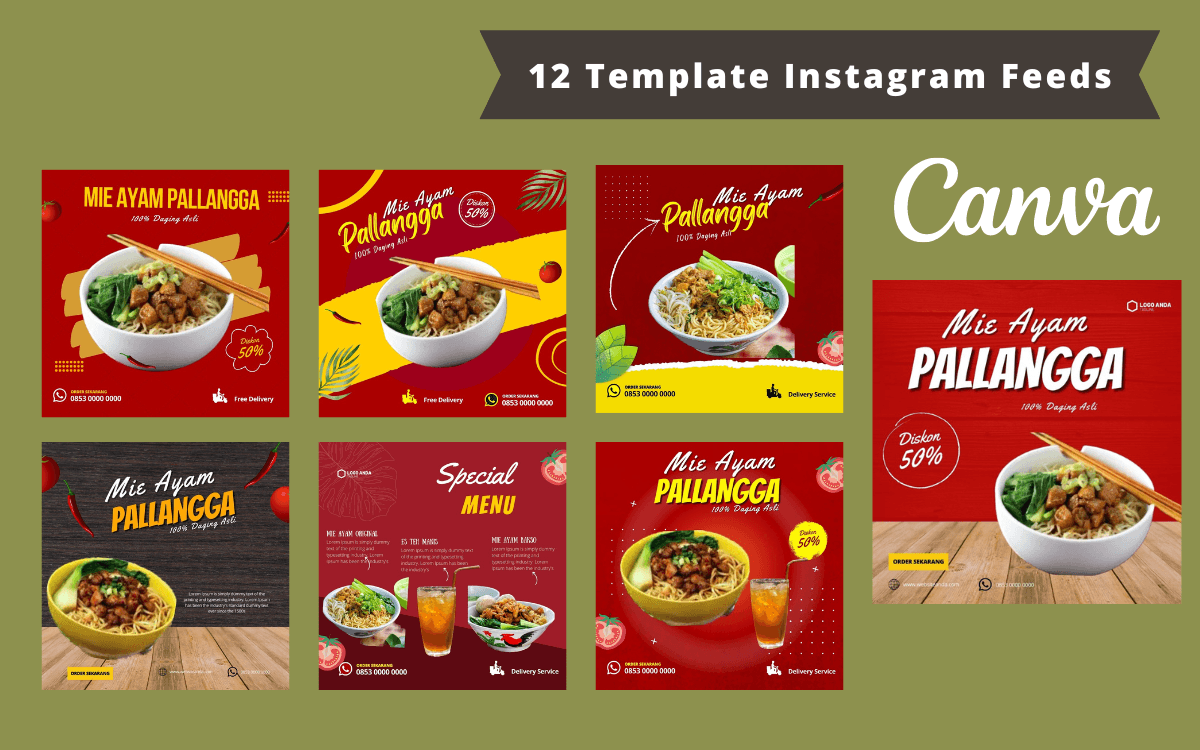 Template Instagram post Feed untuk kebutuhan konten sosial media Anda agar terlihat lebih tertata rapi dan cantik. terdapat 8 template yang bisa Anda edit sesuai kebutuhan. Template ini bisa digunakan sebagai media promosi di Instagram yang menjual mie ayam.